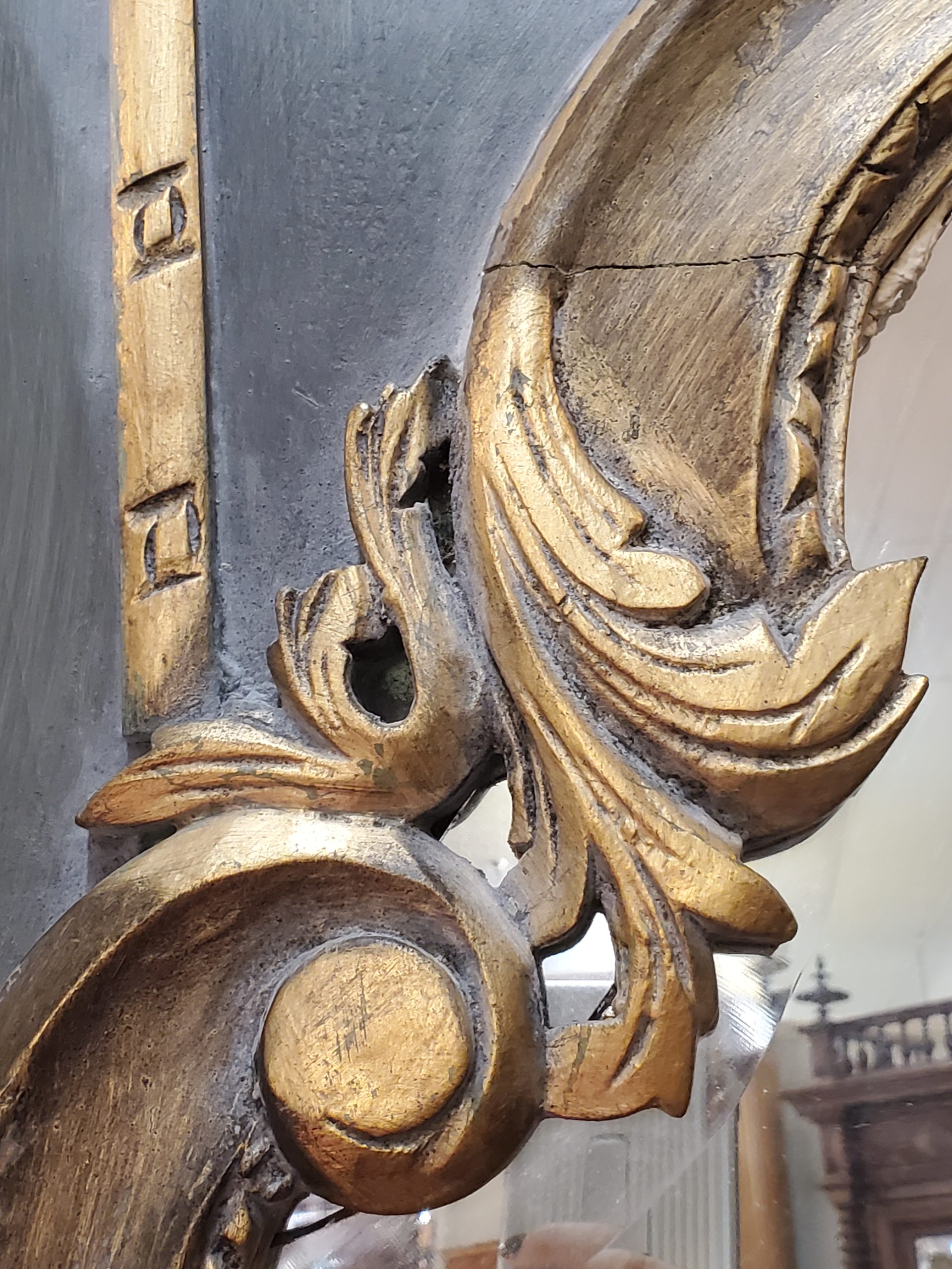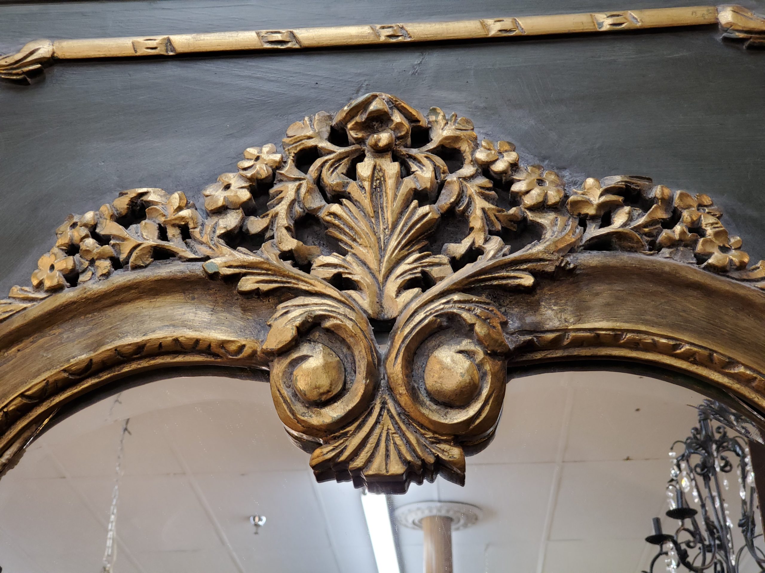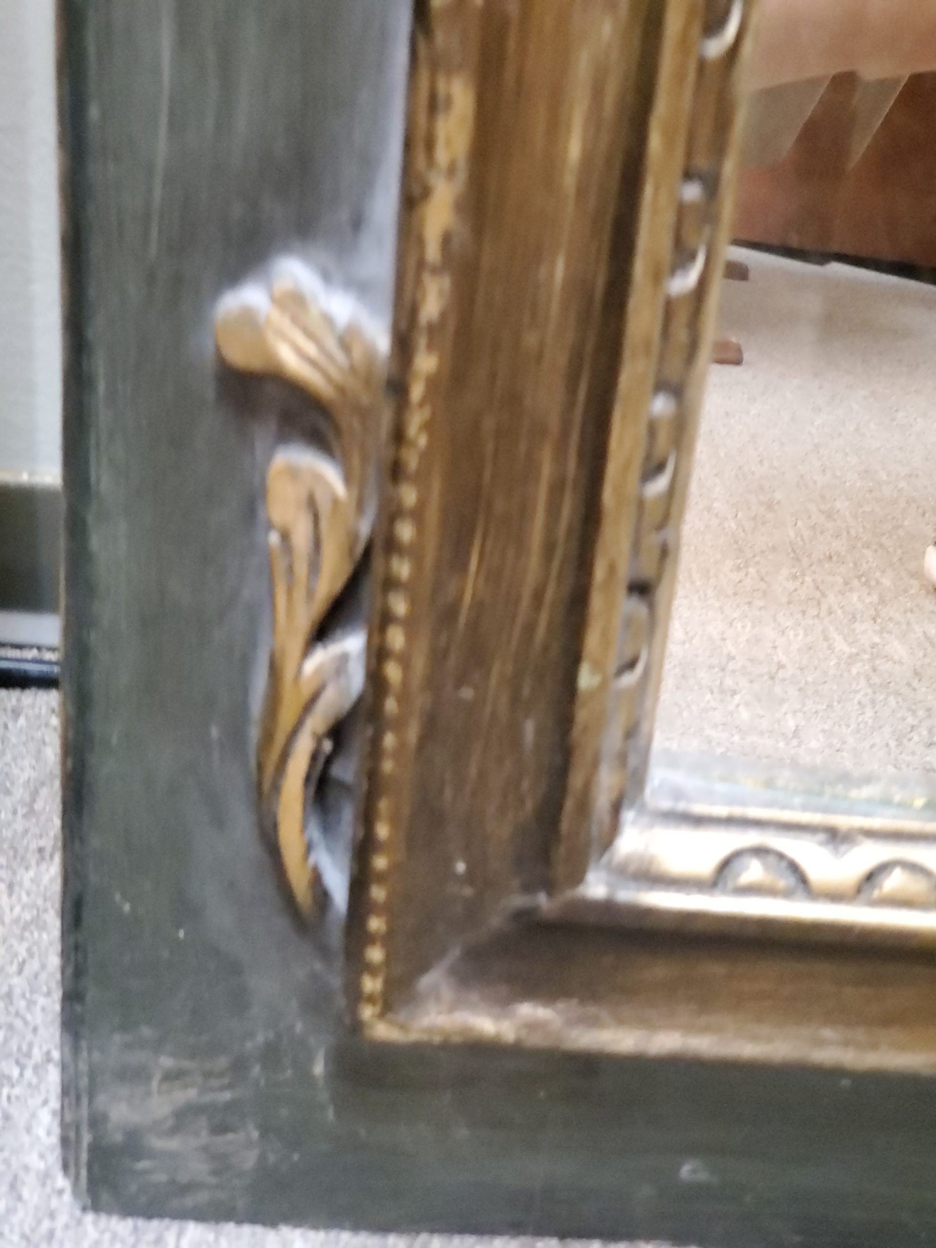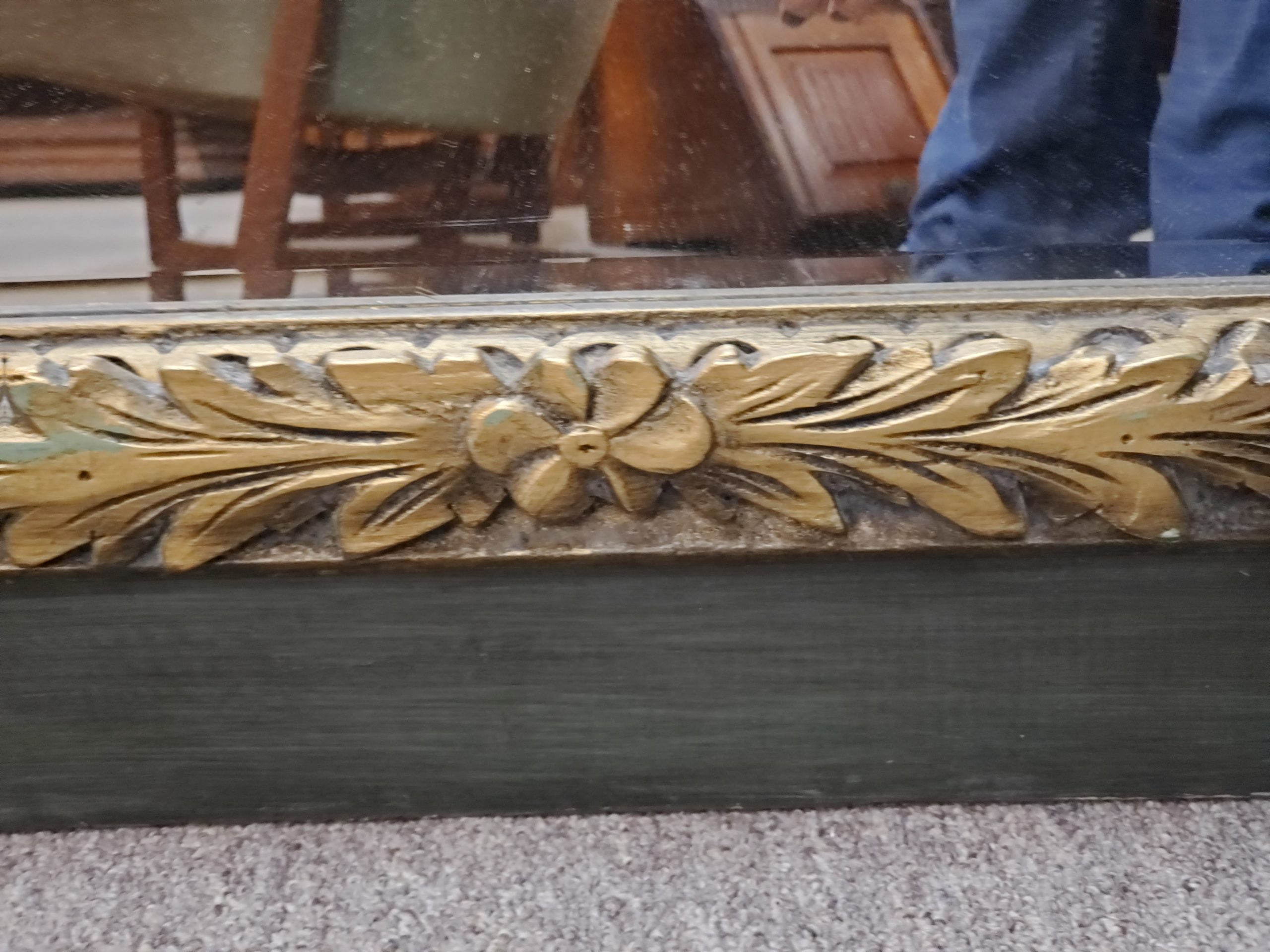 Vintage floor length mirror with beveled edge on a green wood frame and gold trim.