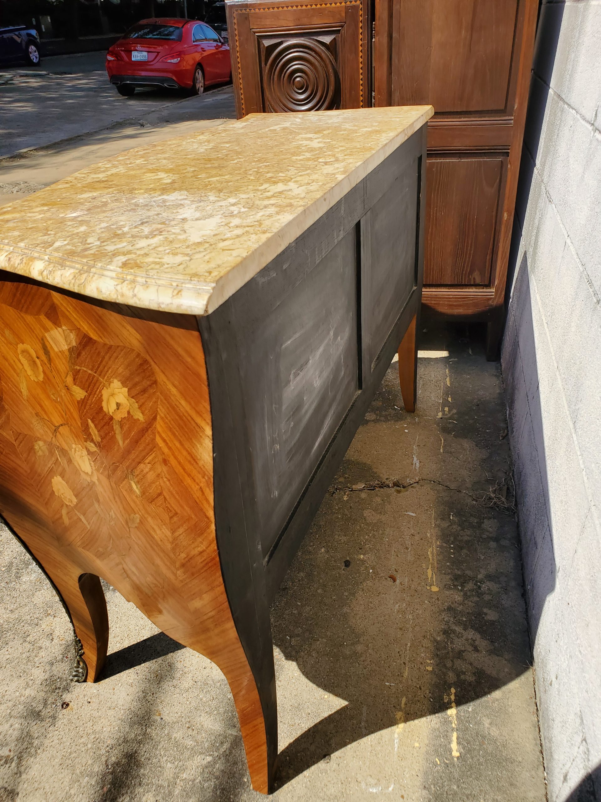 Vintage French Inlaid Marble Top Bombe Chest