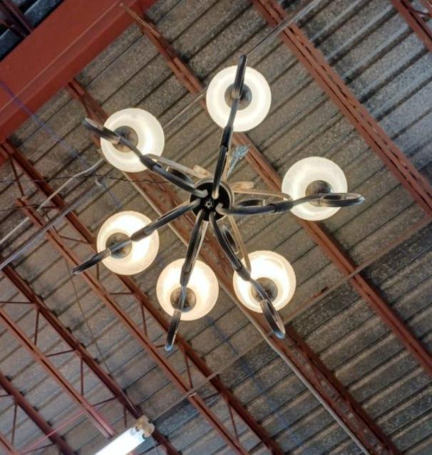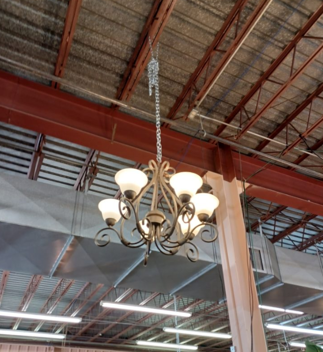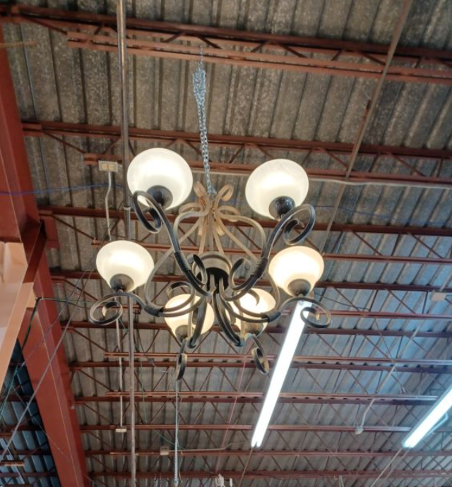 French style wrought iron chandelier. Featuring six lights with open glass shades. A beautiful design with intriguing scroll-work.