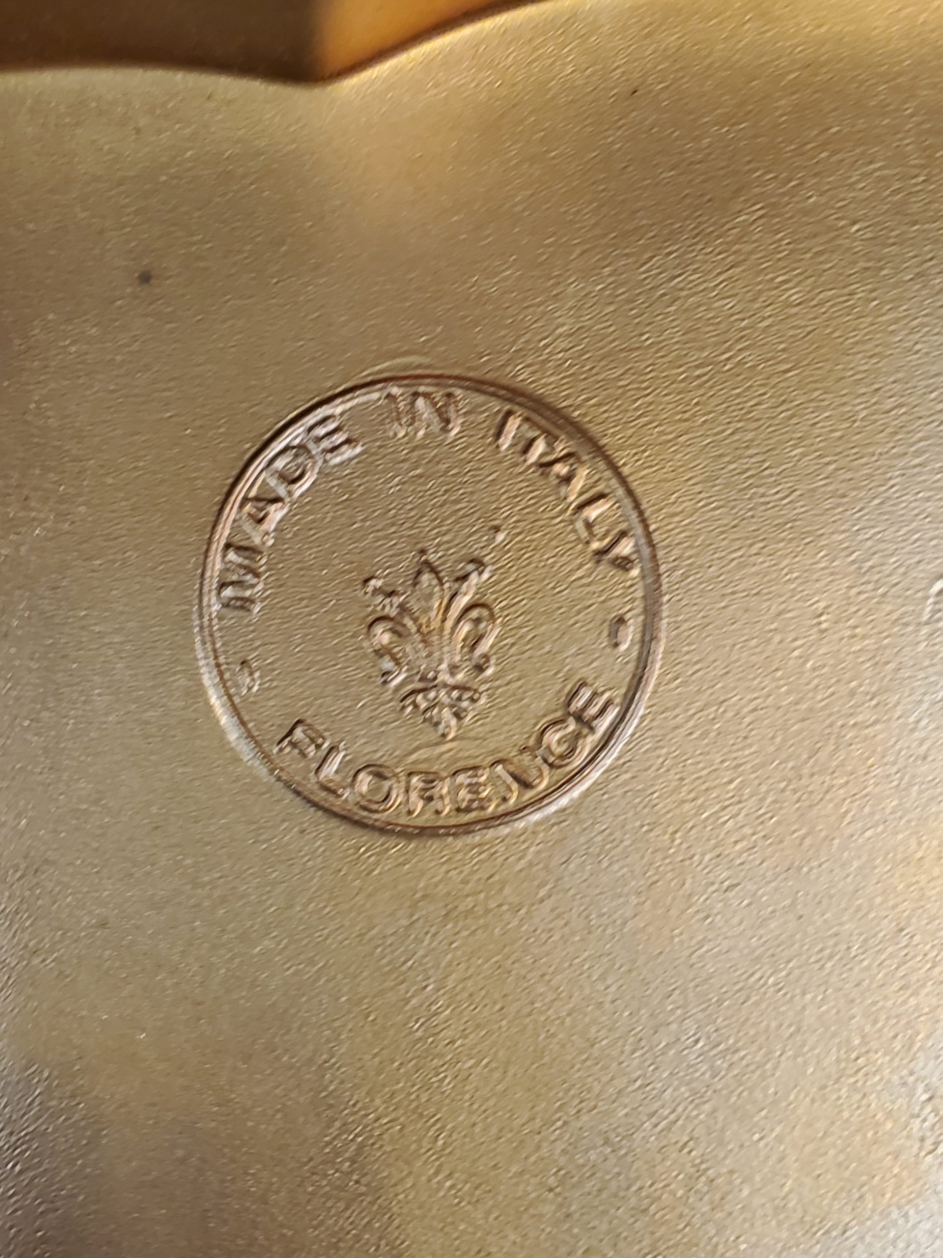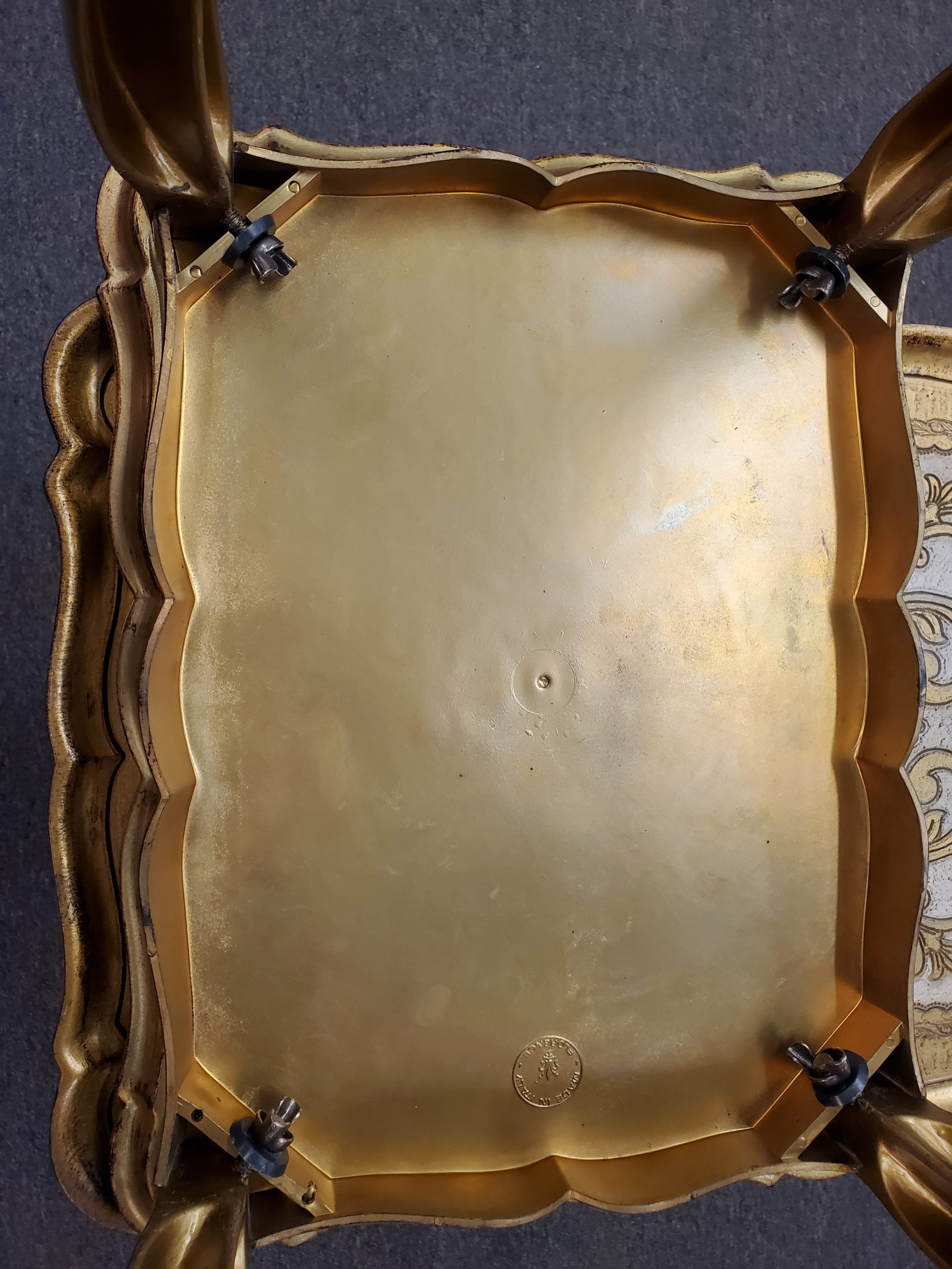 Beautiful set of three Italian Florentine stacking / nesting tables made in Florence, Italy. Gold gilt paint with beige detail, the tops have interesting different patters, they’re stamped on the bottom “Made in Italy” “Florentine” They are made of a hard resin/plastic material made to look like wood and they’re very light weight. The legs attach to the top via wing nuts.