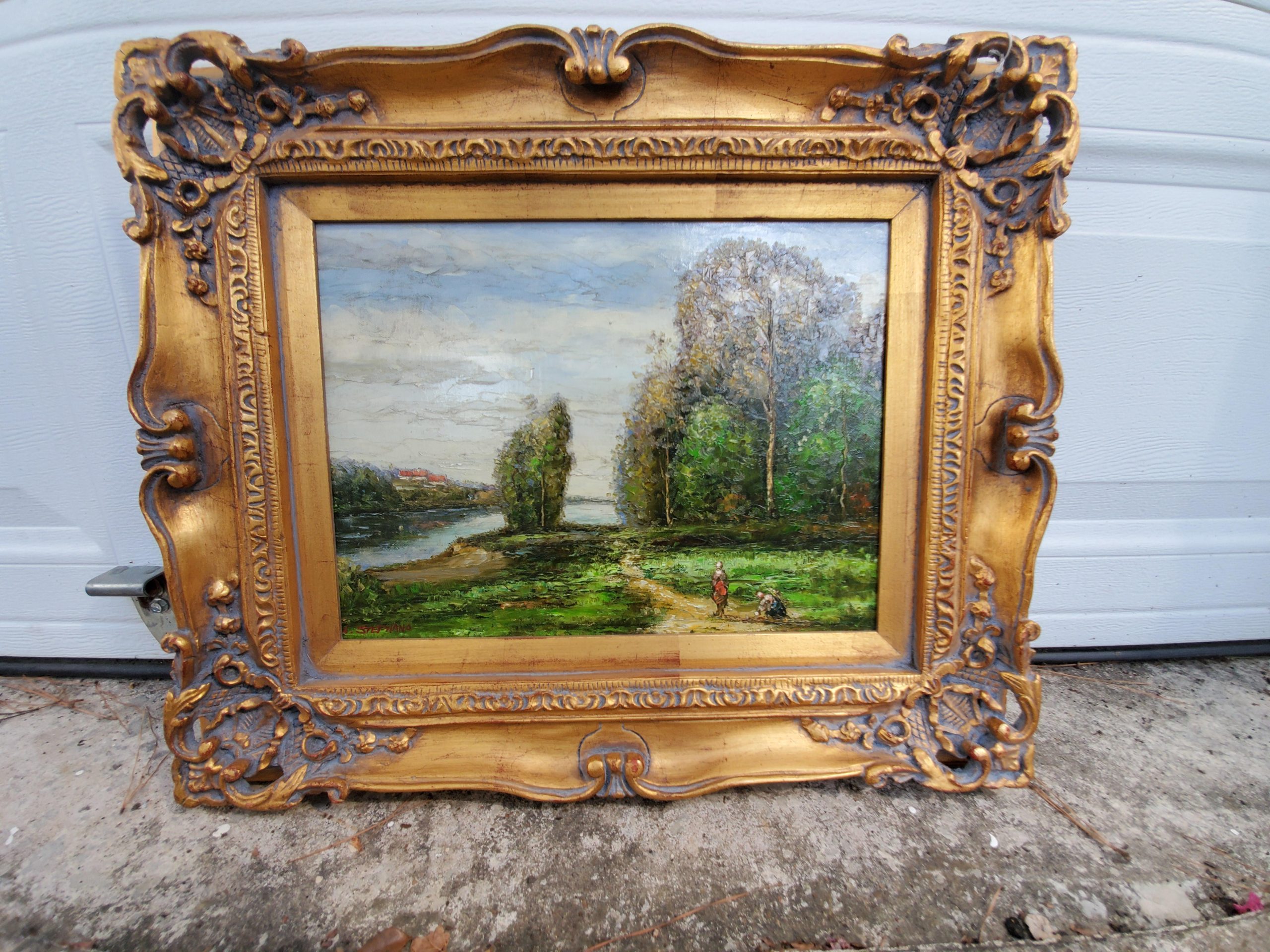 It depicts a pond, a walk way with people walking, and trees. The painting is framed in a gilded ornate frame. Signed on lower left in red L. Stephano.