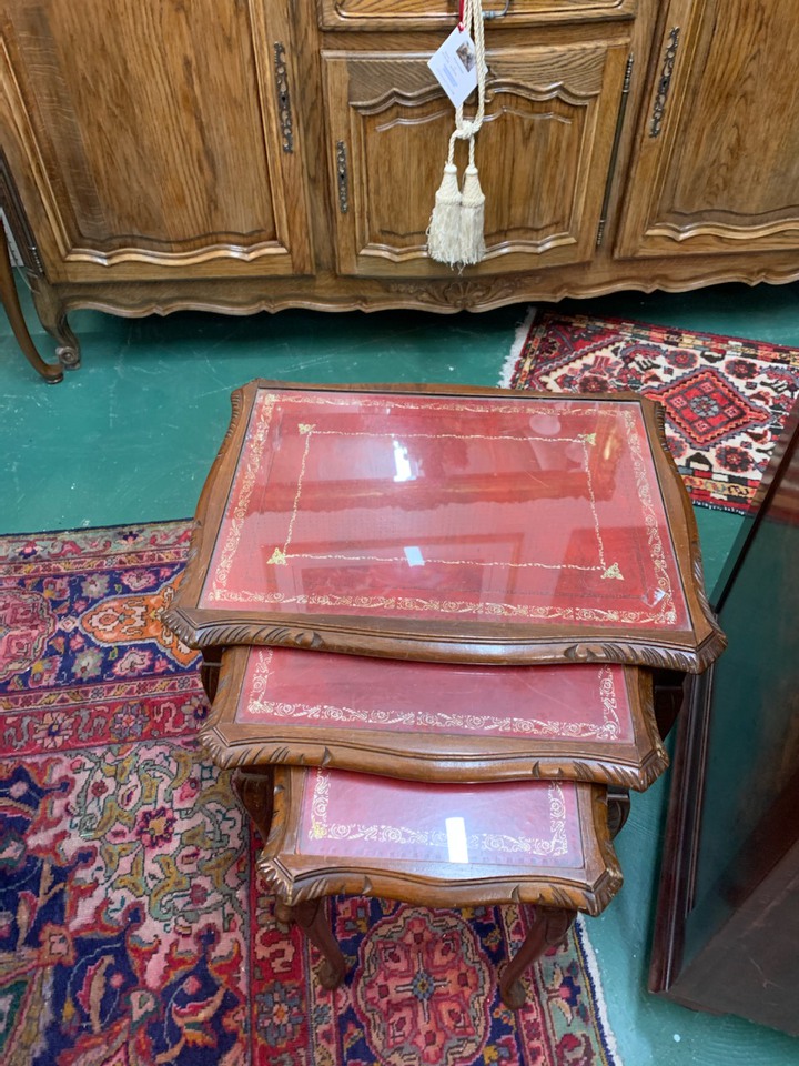 Antique Queen Anne nest of table, they have a red leather inserts overlaid by glass, carved detail on edges and legs. The nests of tables stack into each other.
