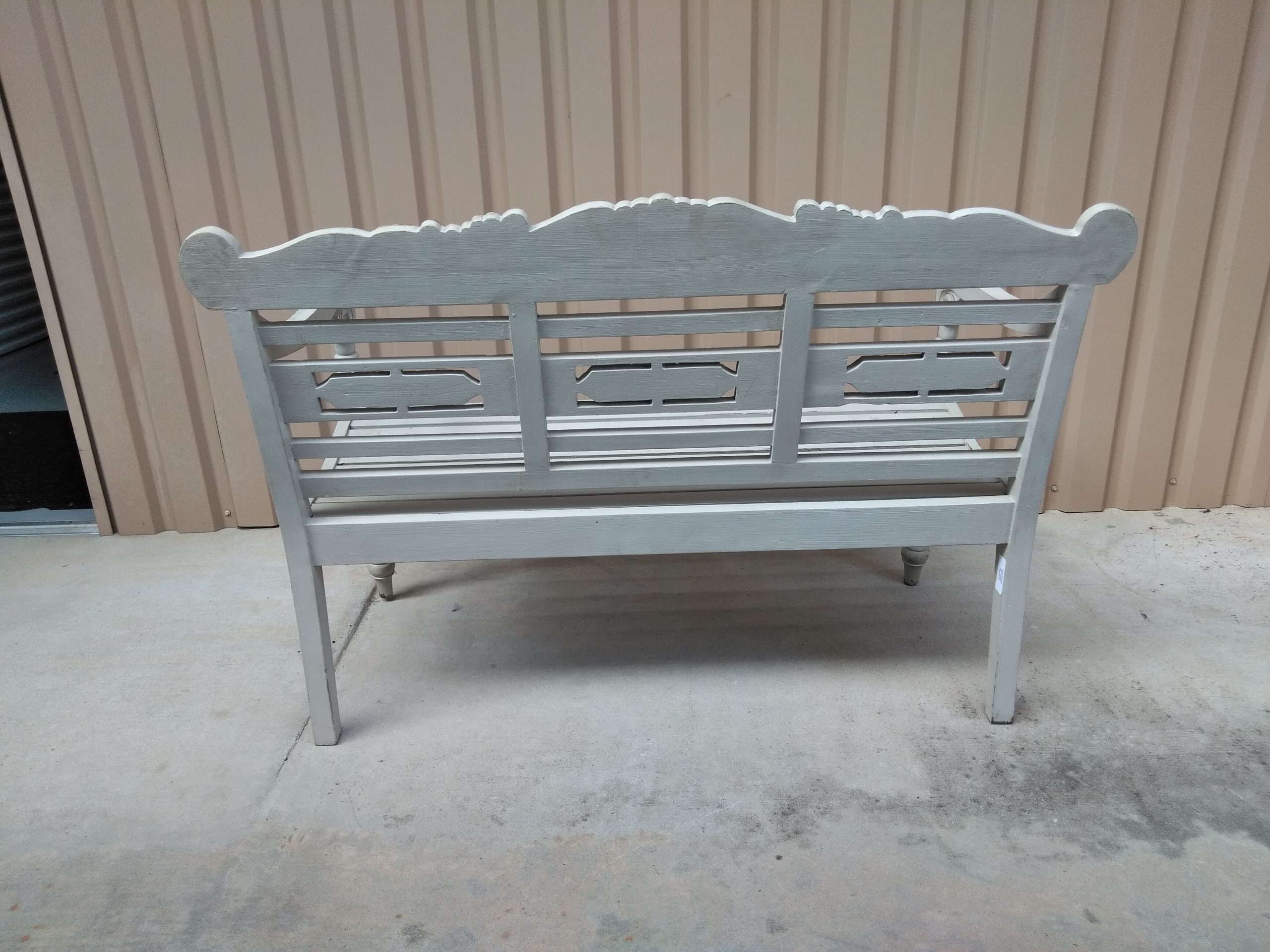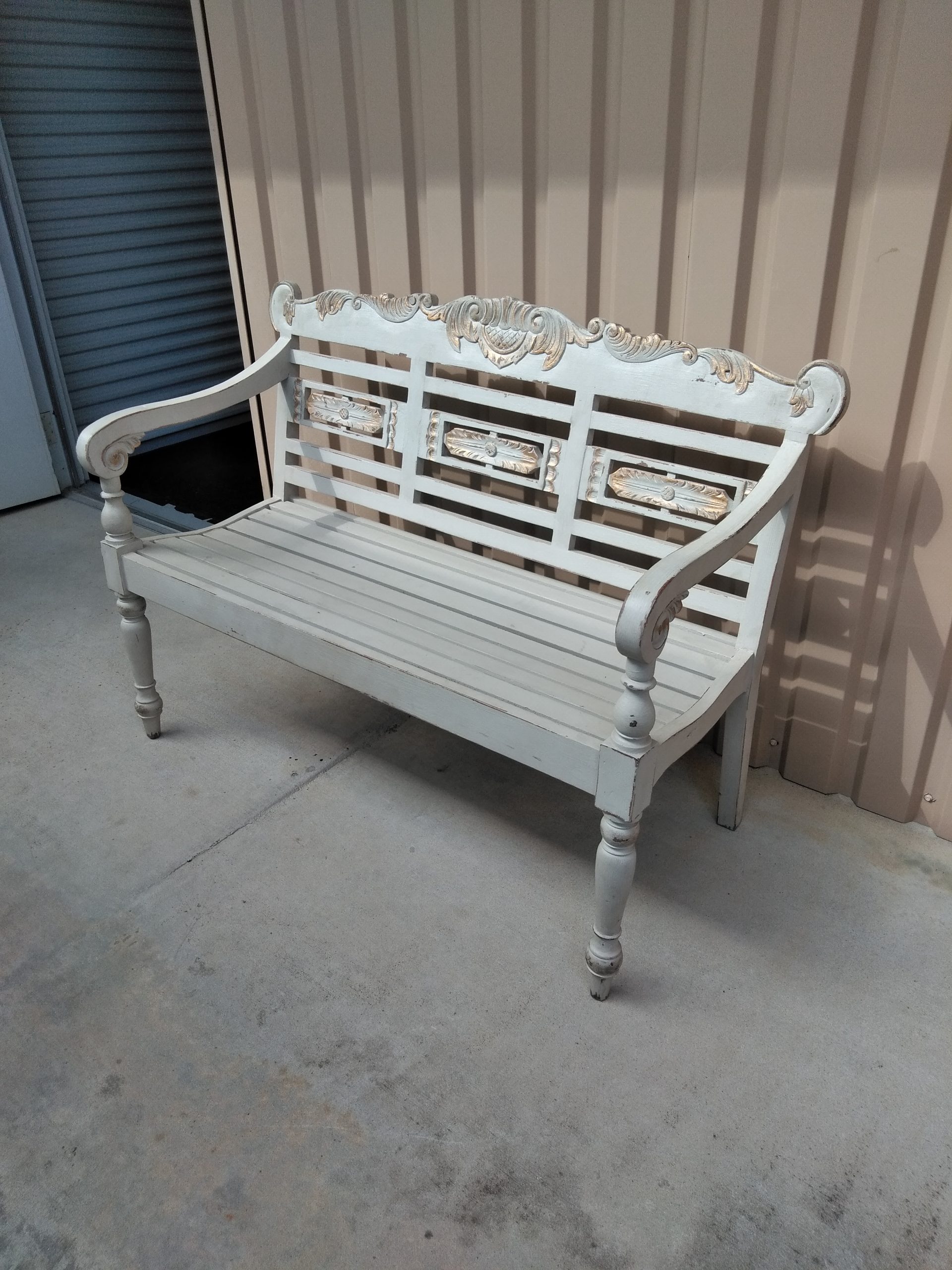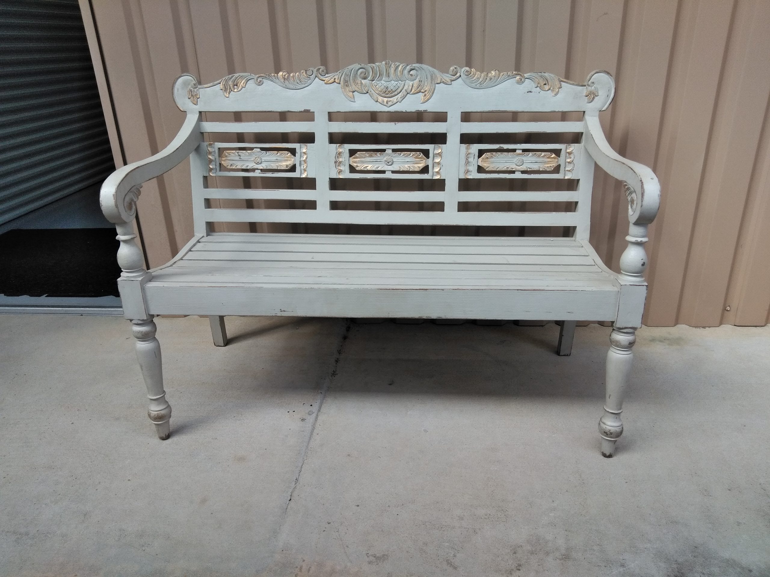 Vintage bench painted in gray with gold accents.
