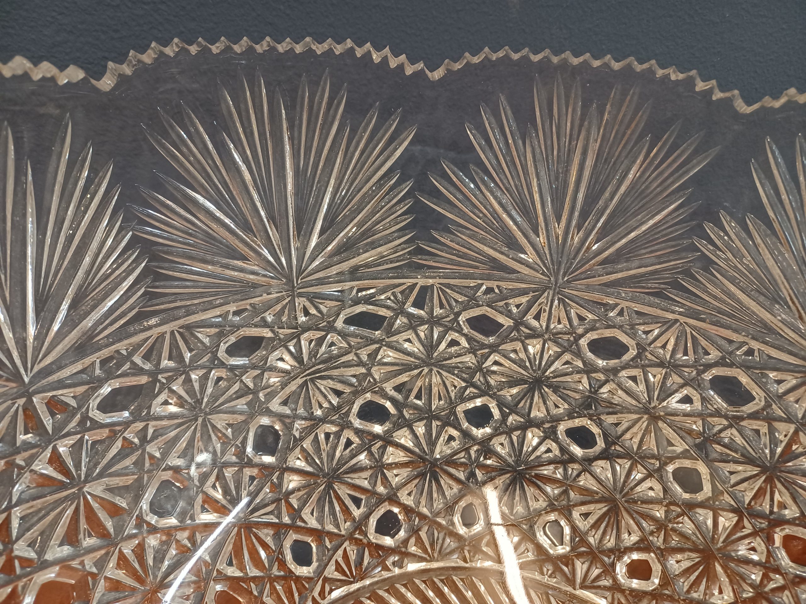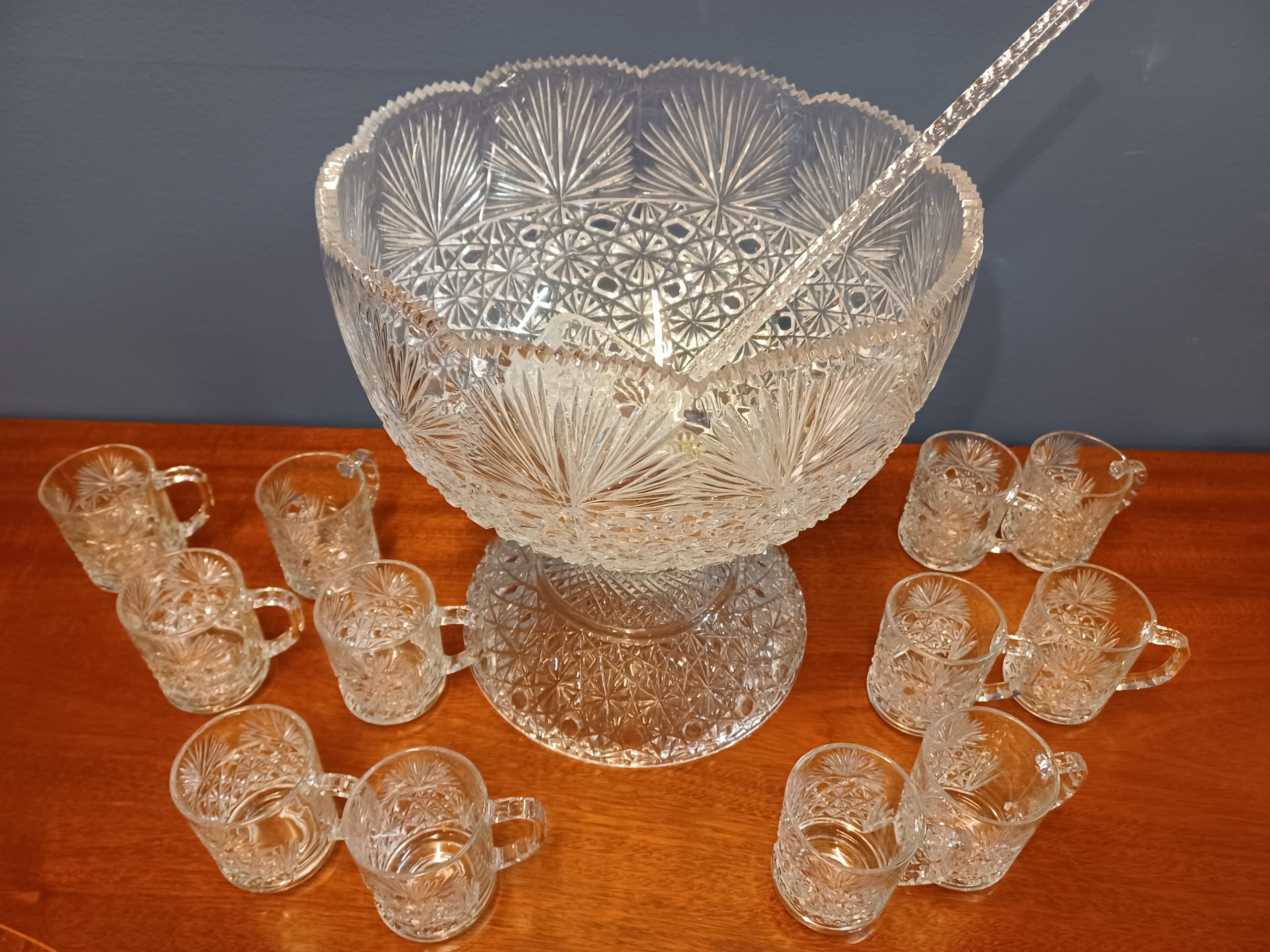 Cut glass punch bowl on pedestal base with ladle and twelve cups with cut fan pattern.