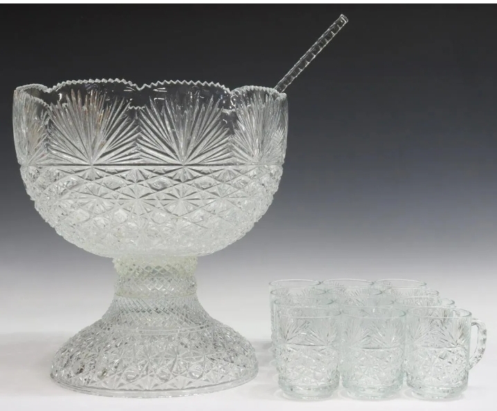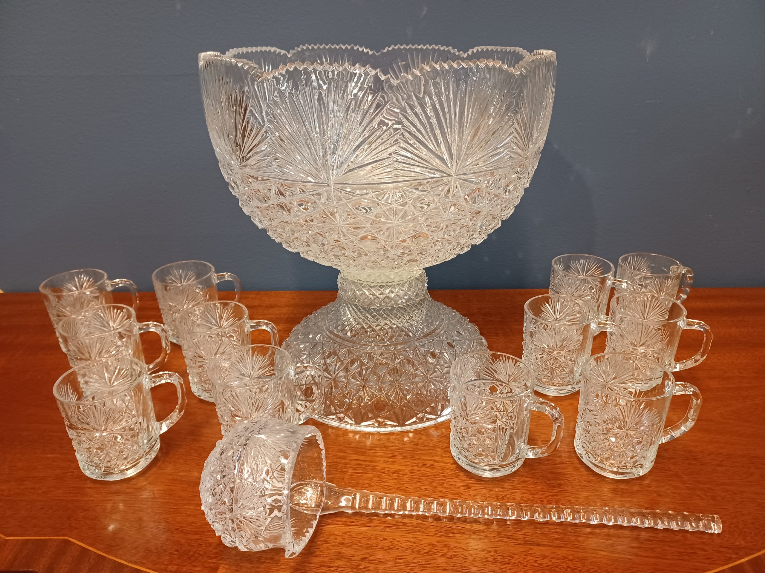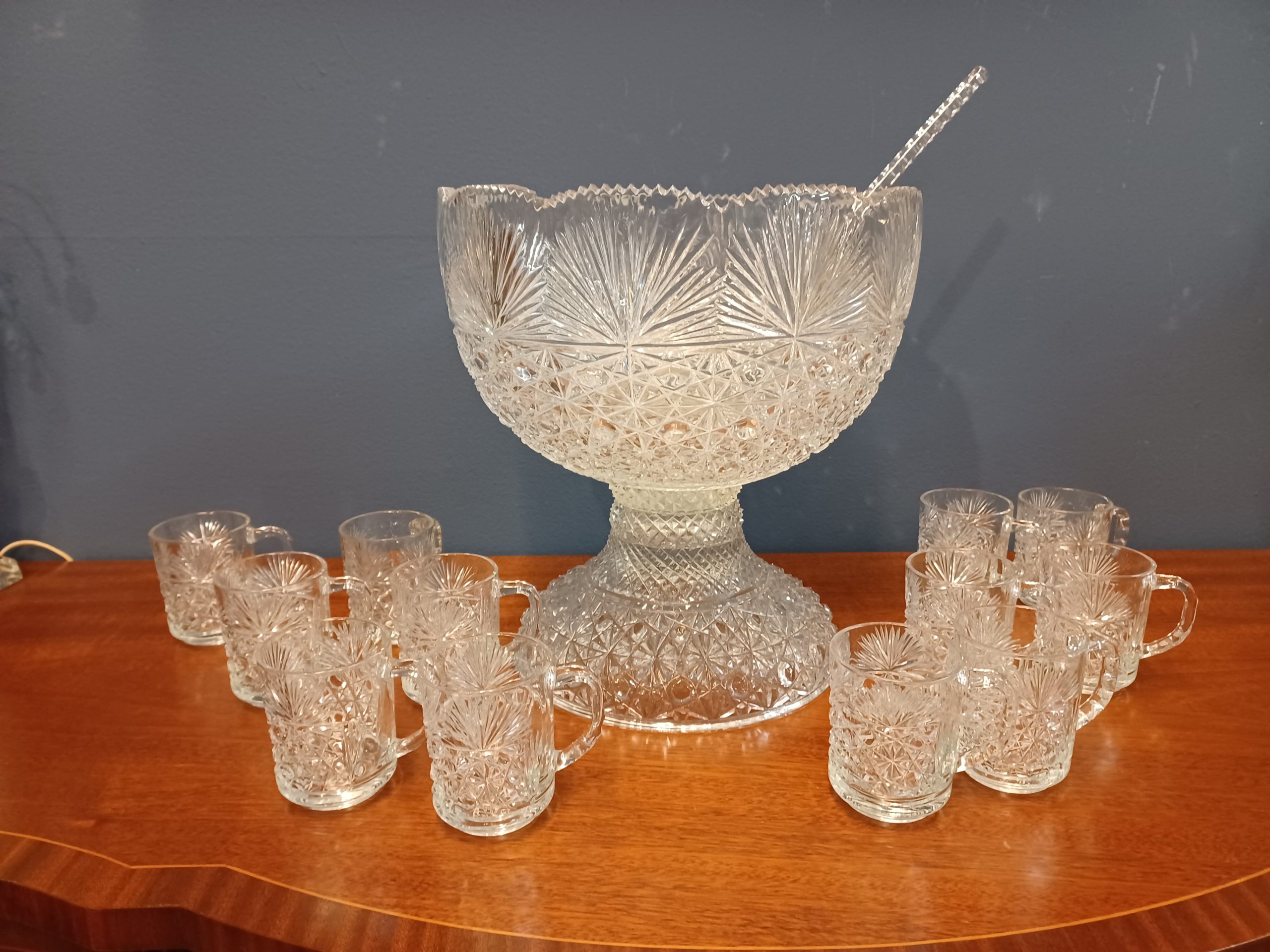 Vintage Punch Bowl and Stand With Twelve Glasses and Ladle